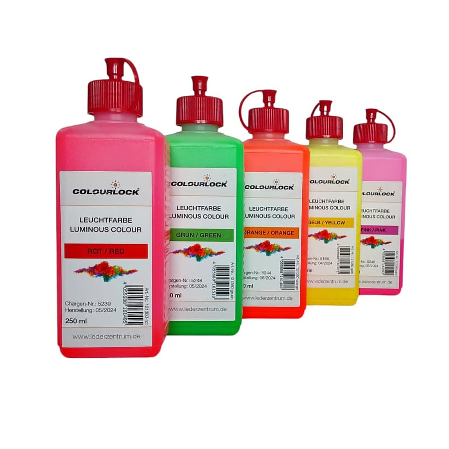Краска для кожи изготовлена на водной основе и, если следовать инструкциям в каждом конкретном случае (предварительная очистка, растворение, грунтовка, покрытие прозрачным лаком), обеспечивает отличную адгезию и укрывистость. Краситель для кожи одобрен для поверхностного окрашивания автомобильной кожи, мебельной кожи и авиационной кожи. Доступен в базовых цветах, а также в виде смеси специальных цветов.