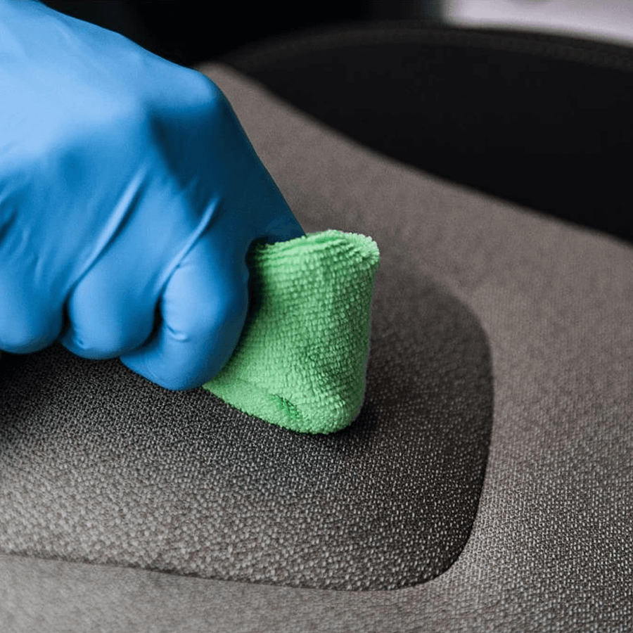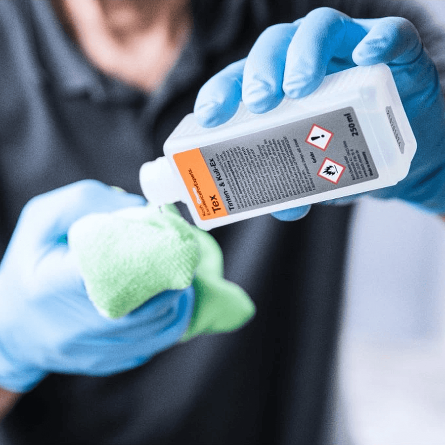 Смочить составом пятно. Через 30 секунд протереть микрофиброй, смоченной составом. Производить сбор загрязнения, перенося его на чистую поверхность микрофибры (собирательные движения). Для работы на пластике использовать мягкую щётку или зубную щётку, смачивая ее и удаляя краску с поверхности структуры пластика. Затем наносить состав для химчистки. Обработать щёткой или паром. Собрать состав с поверхности влажной микрофиброй или моющим пылесосом.