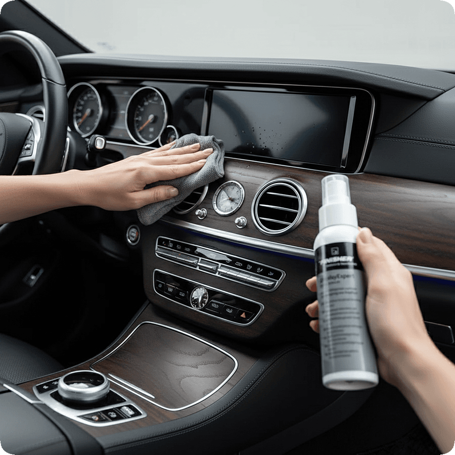 Абсолютная безопасность: Средство безопасно для всех типов поверхностей, включая навигационные системы, TFT-дисплеи, ЖК-экраны, сенсорные панели, а также глянцевые и матовые пластиковые элементы интерьера .